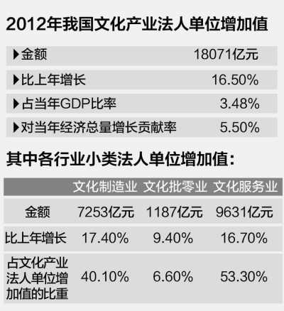 國家統計局今天公布數據顯示:2012年我國文化及相關產業法人單位增加值達18071億元。文化產業對當年經濟總量增長的貢獻為5.5%。