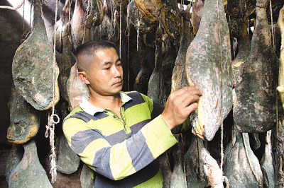 在諾鄧村口的小河邊,老黃的農家樂已經開了好幾年。去年,紀錄片《舌尖上的中國》熱播,第一集就有老黃的鏡頭:“云南人老黃和他的兒子樹江,正在小溪邊搭建一個土灶,這個土灶每年冬天的工作就是熬鹽……生產食鹽為的是制作諾鄧當地獨特的美味……”老黃把視頻截圖印到了店門口的廣告上。他覺得機會來了。他和兒子黃樹江四處借錢,砸下幾百萬元,還請來工人,在一個月時間里腌制了4000多條火腿。老黃說,他們家祖祖輩輩都做火腿,可從來沒這么“海量”,他們決定“賭一把”。
