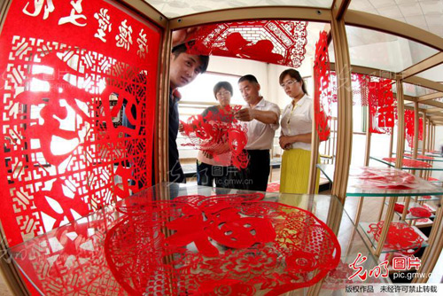坐落于“中華剪紙第一村”——山東無棣水灣鎮(zhèn)前孟橋村的榮德堂,創(chuàng)建于600多年前的明朝永樂年間。其作品豐富多彩、千姿百態(tài),有神話傳說、戲劇臉譜、歷史人物、飛禽走獸、人情風(fēng)俗等3000多個品種。圖為9月23日,榮德堂的剪紙師傅正在給幾個年輕徒弟上課。