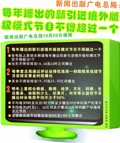 通知強調要加強自主創新和引進管理,對原創節目總局在節目備案、進入黃金時段、各類評優評獎等方面給予優先考慮,各電視上星綜合頻道每年播出的新引進境外版權模式節目不得超過1個,當年不得安排在19∶30—22∶00之間播出。