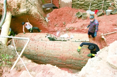 據(jù)了解,這座唐代古墓位于福州市倉(cāng)山區(qū)萬(wàn)春巷福州華能電廠住宅區(qū)內(nèi)。9月22日下午,工人在六號(hào)樓前為電梯井挖深坑的時(shí)候,鏟出了幾塊帶有銅錢(qián)樣式的青磚。施工方當(dāng)即停工并撥打了文物部門(mén)的電話。從當(dāng)天發(fā)現(xiàn)古墓開(kāi)始,小區(qū)專(zhuān)門(mén)聘請(qǐng)了保安24小時(shí)值班,以防古墓被人為破壞。
