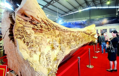 11月14日,參觀者在欣賞大型木雕《清明上河圖》。 當日,大型木雕《清明上河圖》在吉尼斯世界紀錄總部認證官的見證下,成功地創造了吉尼斯世界紀錄,成為世界上最長的木雕。刻在整根樟樹木兩面的大型木雕《清明上河圖》長12.286米、寬2.401米、高3.075米,重約30噸,是福建省工藝美術大師鄭春輝歷時近4年完成的。 新華社記者 林善傳攝