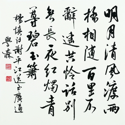 行書最能體現文人含玩生命和優游不迫的情懷,何學森的博士論文是《論行書的形成與風格演變》,其書法創作也于行書用功最深。何學森的行書,由王羲之入門,得俊拔流逸之趣,又浸淫于王獻之手札之中,玩味其尚奇之態。最近幾年,何學森又游心耽玩米芾之爽健奇逸、黃庭堅之開張縱橫,輔以蘇軾的篤實厚重,逐漸形成了醇厚儒雅、俊拔瀟灑的自家風貌。何學森的草書筑基于懷素,線條圓渾遒厚,筆跡流轉自如,毫無浮怯之?。患媸拯S庭堅草書結體的奇崛多變和線條的蕩漾走筆,胎息其氣脈流宕而汪洋恣肆。近年來,何學森的草書勇猛精進,氣象逐漸開張,筆跡日趨老辣,倘輔以墨色變化,必臻新境。