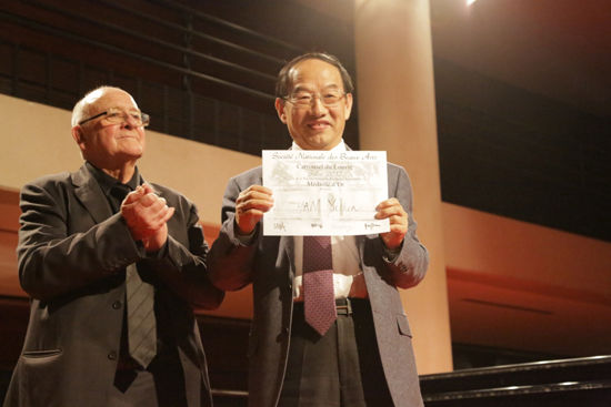 展覽期間,經法國國家美術家協會組織的專家學者認真評選,韓玉臣油畫作品《牧羊女》獲展會最高獎“沙龍展金獎”,攝影作品《業拉山》獲“評委銀獎”。15日晚18時頒獎儀式上,韓玉臣成為第一個上臺領獎的中國藝術家,并以一個人同時獲兩項高獎創本屆展覽記錄。