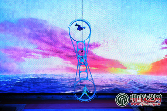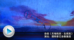 “咿——呀——”第一個節目《俏花旦·集體空竹》先聲奪人,11個俏麗的花旦輕盈上場,空竹抖起,拋向空中,翻身跳躍,再一側身,將空竹穩穩接住,姿態優美,像燕子,像蝴蝶,又像精靈。這個節目將傳統與時尚巧妙融合,曾在2007年央視春晚觀眾最喜愛的節目中獲得一等獎,并獲第37屆摩納哥蒙特卡羅國際馬戲節“金小丑”獎、第26屆法國國際雜技最高獎“法蘭西共和國總統獎”等多項殊榮。火辣的探戈舞串場之后,一個龐大的滾動的軸輪出現在臺上。只見背景屏幕中忽而海浪翻滾,陰云密布,忽而風平浪靜,晚霞映天,一黑一白兩人在海上巨輪中疾走跳躍,好似天與地、生與死不斷輪回。《天地輪回·生死輪》是河南濮陽雜技劇《水秀》片段,《水秀》剛剛在第八屆中國雜技金菊獎第三次劇目獎中獲得優秀劇目獎。