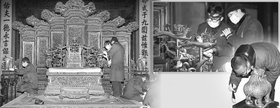 在這難得的日子,太和殿得以“享受”專業的保養和清潔。從地面的“金磚”到金漆雕龍寶座再到琺瑯仙鶴,以往,工作人員只能利用開館前的短暫時間進行清潔和保養,難以達到預期的效果?,F在,他們可以從容細致地打理。金漆雕龍寶座采用透雕工藝,雕刻精致,九條龍造型復雜,龍身轉折部位以及龍鱗、龍須等部位不易操作,工作人員使用軟毛刷和吸塵器將表面塵土去除,在部分角落使用棉簽去除塵土,讓“龍椅”恢復其金光燦燦的原貌。