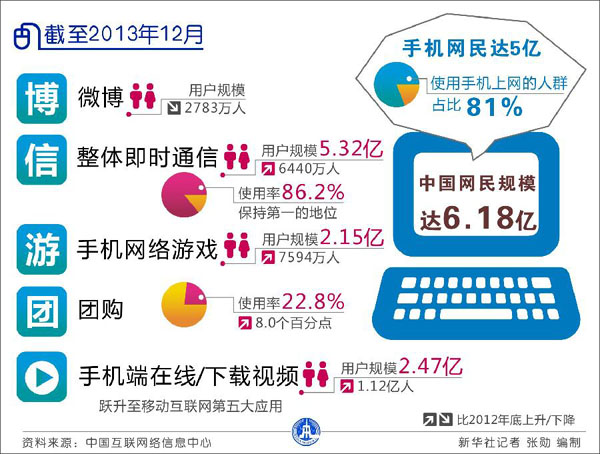 中國互聯網絡信息中心16日發布數據顯示,截至2013年12月,中國網民規模達6.18億。其中,網民中使用手機上網的人群占比由2012年底的74.5%提升至81.0%,手機網民規模繼續保持穩定增長。