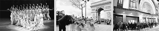 圖片自左至右為《絲路花雨》劇照、在凱旋門前演出現(xiàn)場(chǎng)以及劇場(chǎng)外購(gòu)票的觀眾隊(duì)伍。 賴京晶攝