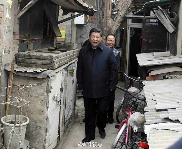 新華網(wǎng)北京2月25日電 據(jù)新華社“新華視點(diǎn)”微博報(bào)道,雨兒胡同29號(hào)、30號(hào)是北京典型的大雜院,院里都是小平房,過(guò)道狹窄。“做飯燒什么?”“取暖方便不方便?”“胡同里幾個(gè)廁所?”總書記走進(jìn)王云鳳等4戶人家,問冷暖,聽心愿。在北京老城區(qū)長(zhǎng)大的習(xí)近平說(shuō),這一片胡同我很熟悉,今天來(lái)看看老街坊,了解大家實(shí)際生活情況。