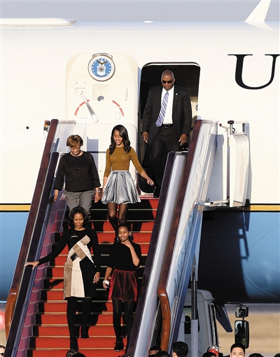 昨日下午5時30分,美國第一夫人米歇爾走出專機艙門,抵京開始訪華。與其一同來訪的家庭成員還有她的母親和兩個女兒。新京報記者 薛珺 攝