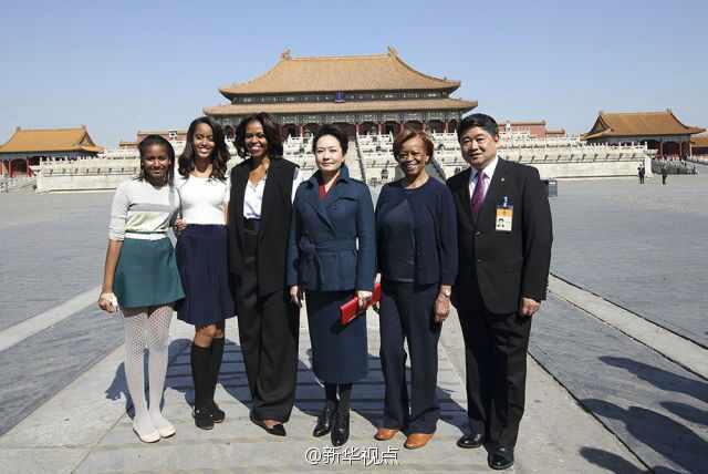 仲春時(shí)節(jié)的北京,陽(yáng)光明媚,春意盎然,故宮的紅墻黃瓦在湛藍(lán)的天空下格外明艷。在太和殿前,彭麗媛同米歇爾及家人合影。