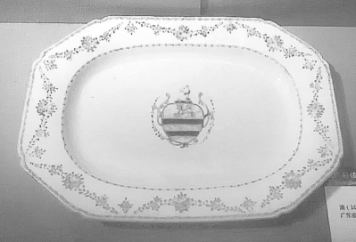 當時歐洲很多顯貴的家族都以能夠擁有一套中國的瓷器為榮,認為這是一件很體面的事情。訂制中國瓷器,成為上流社會的一種時尚。中國南方地區(qū)的各窯口開始根據(jù)外來訂單依樣生產(chǎn)各類西方生活用瓷,其中以繪制歐洲家族徽章的紋章器和剃須盤、果盤、酒杯燈專用瓷器最為常見。“這件廣彩倭角方形徽章盤(上圖)就是一件典型的訂制瓷。”指著一件瓷盤,蔡林介紹道,“不僅它的形狀是長方形,而且在盤的中央印著一個家族的族徽。”