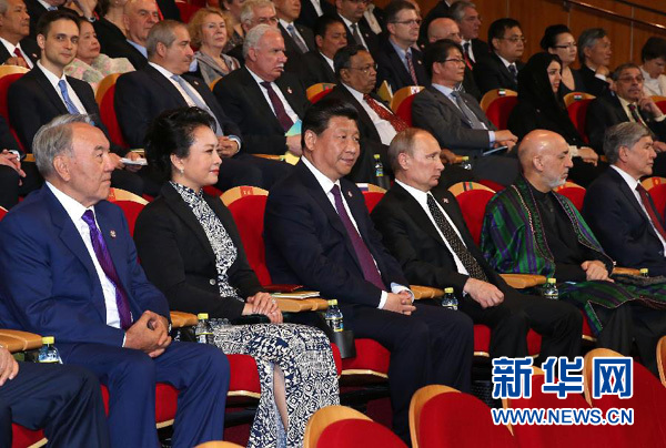 歡迎宴會后,“團結和諧的亞洲-攜手向明天”-亞洲相互協(xié)作與信任措施會議第四次峰會文藝晚會在上海大劇院舉行。