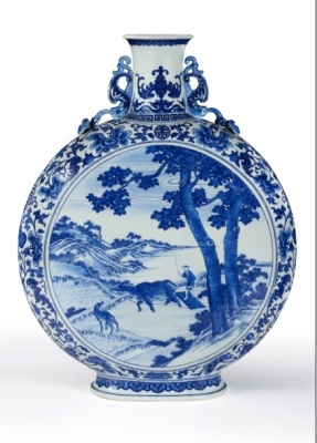 清乾隆 青花春耕圖雙福如意耳特大抱月瓶