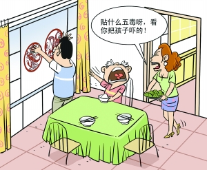 再看不遠(yuǎn)處的剪紙攤位,制作剪紙的老先生特地準(zhǔn)備了幾幅傳統(tǒng)五毒圖案的剪紙。一位姑娘拿起剪紙仔細(xì)端詳,立即花容失色:“這上面怎么都是毒蛇、蝎子?貼在家里多嚇人啊!”老先生趕緊解釋,端午節(jié)前貼五毒剪紙是老傳統(tǒng),端午當(dāng)天正午時(shí)分撕下剪紙,就算是祛病驅(qū)毒了。圍觀的顧客這才恍然大悟。