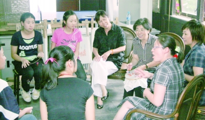 蘇繡制作技藝國家級非物質文化遺產代表性傳承人張美芳(右三)在向聾啞學校的學生傳授蘇繡技藝