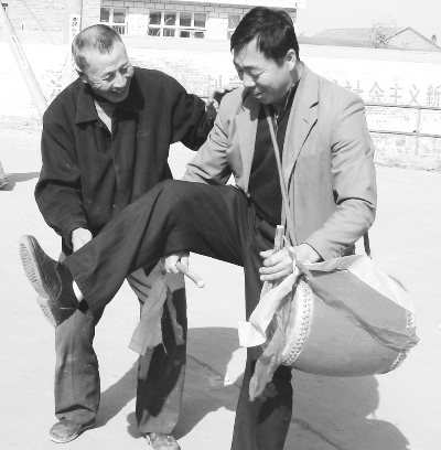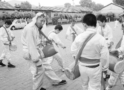 眼前這個被村里人公認的“挎鼓權威人士”今年雖已67歲,講到興奮之處卻像個孩子一樣手舞足蹈:“如今,農活兒不忙時在家也打,鍛煉身體。有時候,幾個老伙伴也常聚在一塊相互切磋鼓法。”賀海說著轉過身去望了一下窗外,不知什么時候,院子里來了好幾個老人。“走,兄弟們,挎起鼓來!”賀海跳下炕一聲吆喝,六七個老漢左肩斜挎著鼓出了院門。