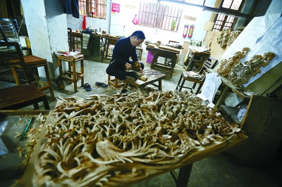 和金漆木雕廠展廳一墻之隔的工廠,只有一位已經退休又返聘回來的陳紹秋師傅在上班。他現在一個月能掙3000元左右。干了半輩子木雕的陳師傅已經習慣了和木料待在一起,干起活自有一套熟練的老把式。可惜的是,在這里做學徒的三四位年輕人卻因為有事沒來上班,而這種情況似乎經常發生?!敖?0年可以說是新中國成立后潮州木雕市場最好的10年,但潮州木雕發展面臨著一些制約因素,歸根結底還是人才缺失的問題?!睏顖云秸f。
