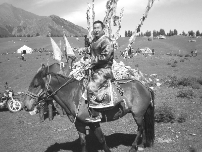 巴塔第一次接觸《江格爾》是在他六七歲時的一個晚上,屋里點著蠟燭,光線很暗,他的養父坐在床邊,開始一句句小聲地說唱《江格爾》,就在那一刻,巴塔被《江格爾》中的人物、情節牢牢吸引。于是,他兩個晚上便學會了一段20多分鐘的《江格爾》。養父見他如此喜愛、好學,非常欣喜。而養父的夸獎對于初學《江格爾》的巴塔來說,更是一種莫大的鼓勵。因而,他更加用心地學習《江格爾》。