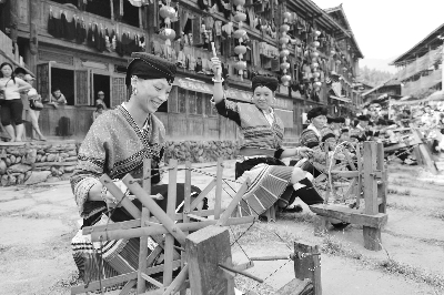 近日,居住在廣西龍勝各族自治縣和平鄉金坑瑤寨的瑤族同胞們迎來了傳統節日“曬衣節”。每逢農歷六月初六,當地紅瑤(瑤族支系)婦女都會在屋外掛出鮮艷的民族服裝晾曬,企盼去除晦氣。同時,當地紅瑤群眾還會穿上節日盛裝,為來自各地的游客表演紅瑤迎親、瑤族姑娘繡女紅等極具傳統民族特色的節目。圖為紅瑤婦女在展示傳統編織工藝步驟。