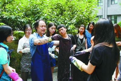 傳承人吳元新在中央美院講授藍印花布染色技藝(資料圖)