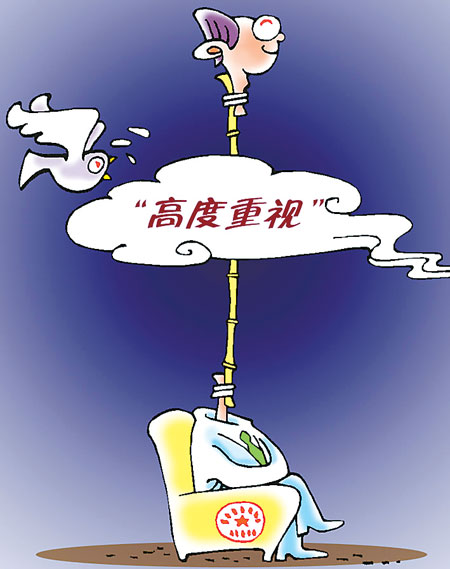 《人民日報(bào)》近日在讀者來信版向網(wǎng)友征集“你最反感的官話套話”,“高度重視”成了頭號選項(xiàng)。的確,許多個“高度重視”,只是徒有“高度”,卻往往并不緊密貼合百姓意愿的實(shí)際;口稱“重視”,偏偏只聞雷聲不見雨點(diǎn)。這類“官話宣言”、“套話做秀”,其實(shí)對社會的實(shí)質(zhì)進(jìn)步毫無價(jià)值。有道是:官話套話太常見,“高度重視”成笑談;只盼公仆干實(shí)事,樂為百姓多解難。
