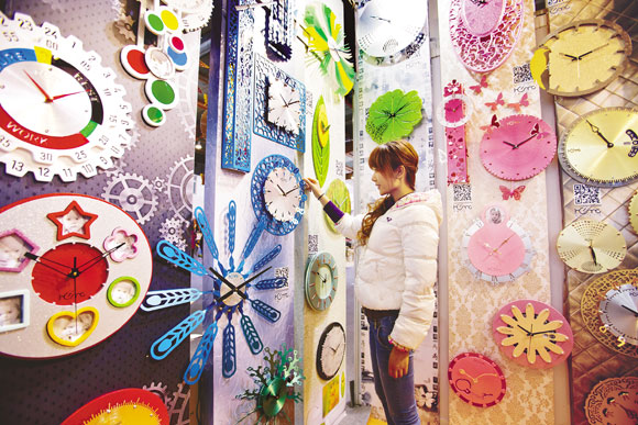 3月13日, 2014年中國·北京國際禮品、贈品及家庭用品(春季)展覽會在北京中國國際展覽中心開幕。圖為觀眾在禮品展上參觀各式創意鐘表。新華社發 趙冰 攝