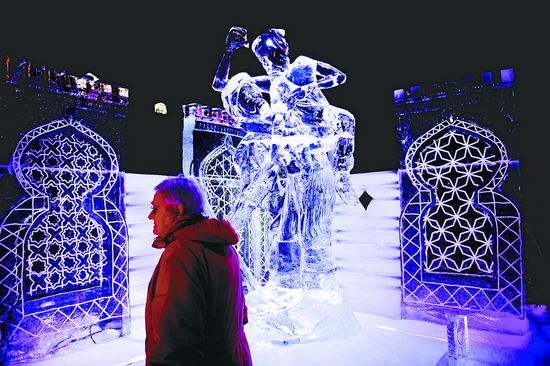 12月15日,游客在荷蘭茲沃勒參觀冰雕展。國際冰雕展近日在荷蘭中部城市茲沃勒拉開帷幕。來自世界各地的40多名藝術家耗費25噸冰和25噸雪,雕刻出一組組栩栩如生的冰雕作品。展覽將持續到明年1月底。