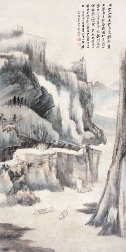 早期的張大千曾遍臨古畫,對石濤、八大、徐渭以至宋元諸家,皆能得其精髓。這件山水圖畫于1940 年,是仿古階段后期的作品,當時畫家42歲,正在成都。他追憶自己游覽嘉陵江時的情形,將寫生與仿古結合起來,描繪了一幅氣勢激昂的峽江勝景圖。 張大千畫神通廣大的“七十二般變化”已屢屢見諸文字,而他善借古畫章法布局的軀殻自出機杼的“翻身作怪”,亦乃其五十歲前創作的慣例,也久矣成為人們津津樂道的佳話,此皆不消筆者饒舌。此件《嘉陵明月峽》,乃正是張氏明修棧道、暗渡陳倉,似古實新、融古開今的極具代表性的杰作。