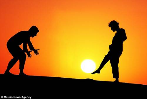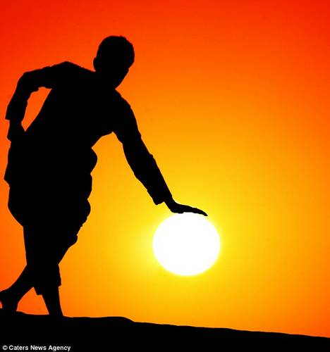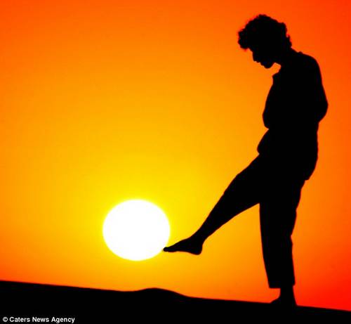 23歲的攝影師Malek別出心裁的利用錯位拍攝法拍攝出了一組有趣的人與太陽的合影。合影中有女人“托舉”起太陽的照片也有兩個男人把太陽當球踢的照片。