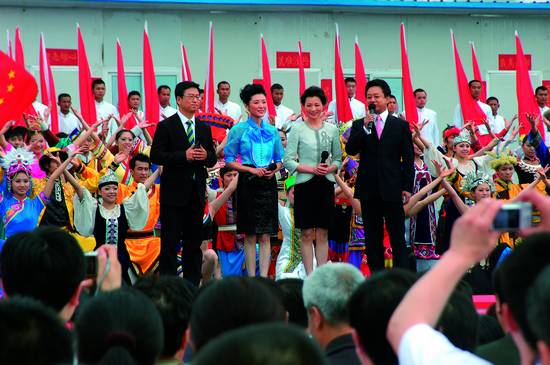 2009年5月,中央電視臺主持人白巖松、周濤、董卿、朱軍在綿竹二號立交橋板房區(qū)參加慰問演出活動。攝影:林兆貴