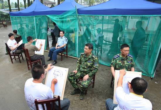 2008年6月,來自北京等地的國內(nèi)著名畫家在四川地震災(zāi)區(qū),為抗震救災(zāi)的部隊官兵寫生作畫。攝影:張風(fēng)