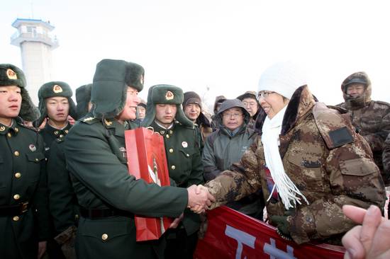 2012年1月1日,中國文聯(lián)黨組書記,副主席趙實(右二)代表“送歡樂,下基層”藝術(shù)家們慰問“東方第一哨”的數(shù)戍邊官兵。攝影 呂衍海