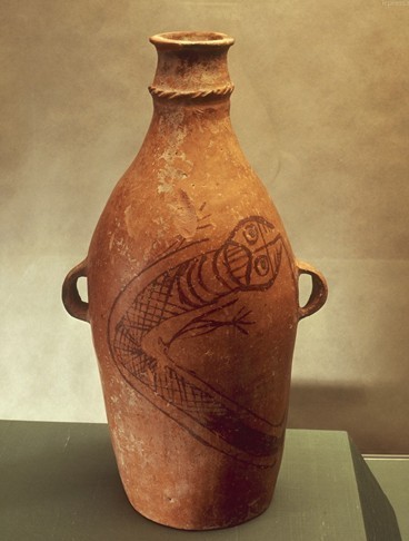 繪有有足蛇類圖案的雙耳細頸橢圓陶土罐,中國史前時期,公元前3000年。