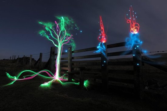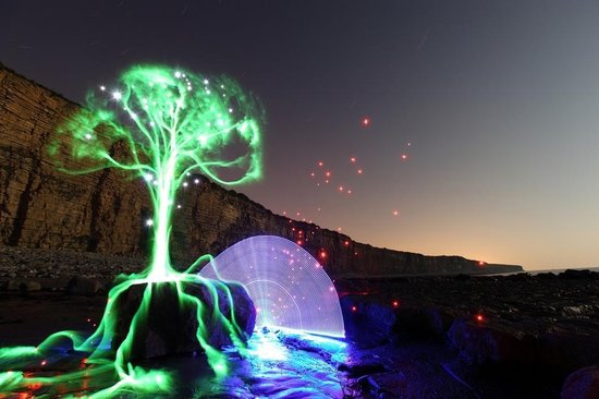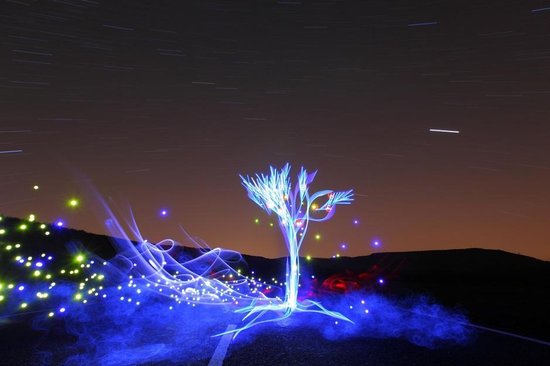 “光畫(huà)”屬于一種獨(dú)特的繪畫(huà)技藝,畫(huà)家在黑暗的條件中利用手中的“光筆”作畫(huà),被稱之為“黑暗中的光樂(lè)園”。因?yàn)楣猱?huà)一般不會(huì)持續(xù)很長(zhǎng)時(shí)間,隨著時(shí)間它會(huì)慢慢消逝,所以畫(huà)畫(huà)過(guò)程中相機(jī)快門(mén)需要保持在開(kāi)著的狀態(tài),以便及時(shí)拍攝記載。