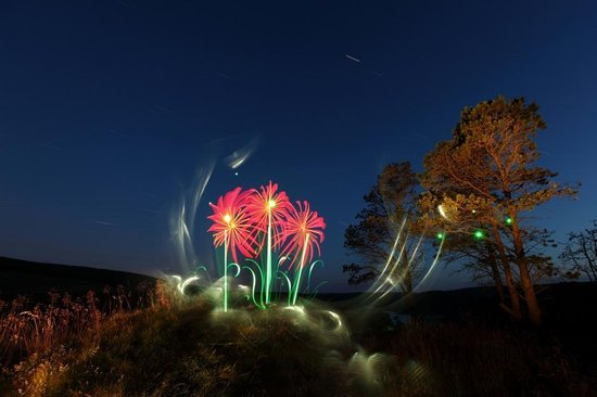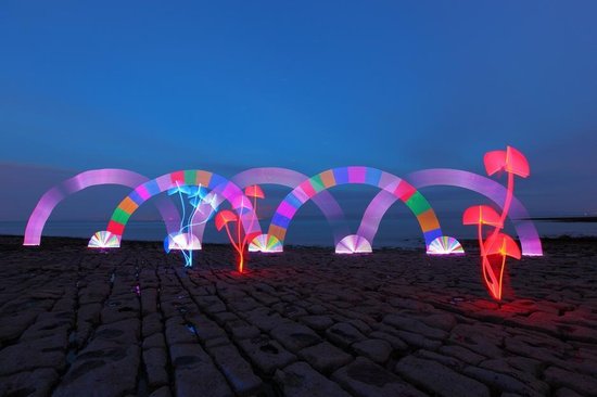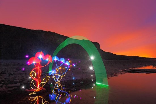 英國(guó)藝術(shù)家及攝影師邁克爾·博桑科(Michael Bosanko)用其惟妙惟肖的“光畫(huà)”作品,點(diǎn)亮了威爾士郊區(qū)黑暗的沙灘。從舞蹈的墨西哥風(fēng)格仙人掌,到海邊盛開(kāi)的橙色雛菊,邁克爾獨(dú)特的“光影涂鴉”作品在海灘上依次綻放開(kāi)來(lái),造成了令人驚嘆的奇異景象。