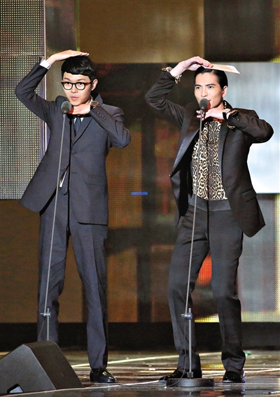 方大同與蕭敬騰一起搭檔頒發(fā)最佳新人獎(jiǎng),并以“過來人”的姿態(tài)回憶了各自在金曲獎(jiǎng)的提名成績(jī)。蕭敬騰調(diào)侃方大同三次提名卻未獲獎(jiǎng),很倒霉,而方大同卻“以德報(bào)怨”祝福蕭敬騰能得獎(jiǎng)。最后,兩人還自嘲自己的封面專輯很丑,因?yàn)樗麄兌际恰按箢^”。