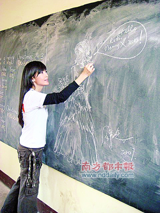 周慧敏探訪貧困山區兒童時即興畫畫。