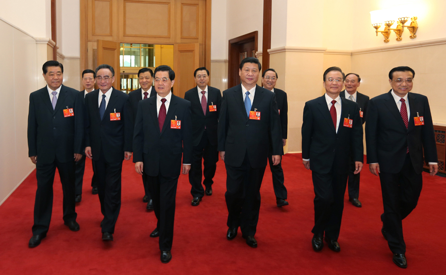 3月5日,第十二屆全國人民代表大會第一次會議在北京人民大會堂開幕。這是胡錦濤、習近平、吳邦國、溫家寶、賈慶林、李克強、張德江、俞正聲、劉云山、王岐山、張高麗等步入會場。新華社記者 蘭紅光 攝
