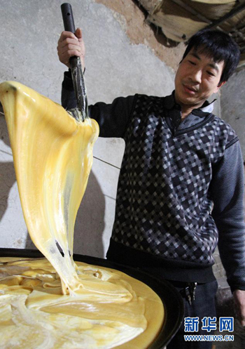 2月1日,河南省焦作市武陟縣小董鄉賈村一家作坊的制糖工人在展示經過5個小時熬制后的芝麻糖糖漿。 2月3日是農歷臘月廿三,民間俗稱“小年”。節日臨近,賈村的制糖作坊分外忙碌。據了解,該村有悠久的制糖歷史,村民以玉米糖稀和芝麻為主要原料做成香脆可口的芝麻糖,暢銷市場。每到農歷正月廿四,賈村都要舉辦規模盛大的糖會,展示各色糖品。新華社發(秦林林 攝)