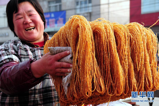 2月1日,山東省臨沂市郯城縣馬頭鎮一家老字號食品店的工作人員在展示剛出鍋的油炸馓子。 2月3日是農歷臘月廿三,民間俗稱“小年”。郯城縣有“小年來到炸馓子放炮”的傳統習俗。當地老字號食品店的傳統食品油炸馓子很受歡迎,人們紛紛選購以備“小年”這天款待客人、饋贈親朋。新華社發(房德華 攝)