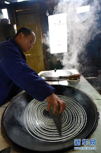 湖北省宣恩縣上湖塘村村民在烙“豆皮”(1月26日攝)。 2月3日是農歷臘月廿三,民間俗稱“小年”。節日臨近,湖北省恩施土家族苗族自治州各地群眾按照傳統習俗備年貨,糍粑、豆皮、包谷糖等帶著濃濃土家“年味”的特色食品,是當地群眾的必備年貨。新華社發(宋文 攝)