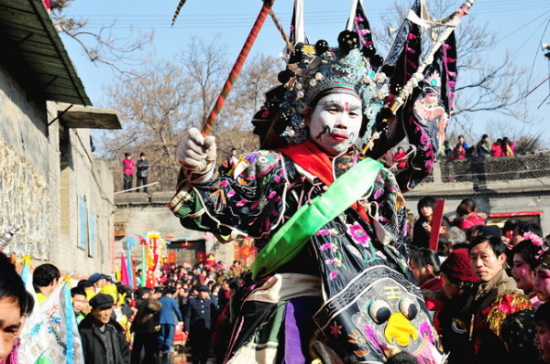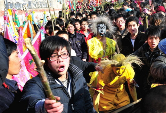 王曉培說,雖然正月十五的氣溫還很低,但是“大鬼”、“二鬼”和“跳鬼”卻要身著單衣,走到街上面目猙獰地擺弄出勇猛無畏的姿態(tài),驅(qū)邪捉“黃鬼”。“黃鬼”全身和頭發(fā)都被涂滿黃色染料,四處逃竄。村民們舉著樹枝和木棍,隨著三個“鬼差”追鬼和打鬼。黃鬼在最后得到嚴懲,也象征著人類戰(zhàn)勝了邪惡、災(zāi)難和疾病。在表演“捉黃鬼”時,“財神”、“土地爺”、“城隍”等角色也會紛紛“亮相”向“玉皇大帝”跪拜祈福。