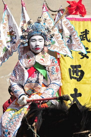 身穿鎧甲、扎著靠旗的黑白探馬引路