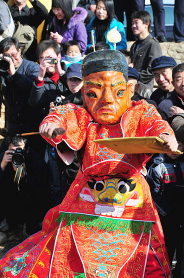 正月十五:凌晨三點左右開始踏鞭,大鬼二鬼開始轉(zhuǎn)村轉(zhuǎn)戶,早晨七點左右抓住黃鬼,開始引道子,轉(zhuǎn)村,中午到村外的斬妖臺,審判,將黃鬼抽腸剝皮,儺戲的最高潮部分。