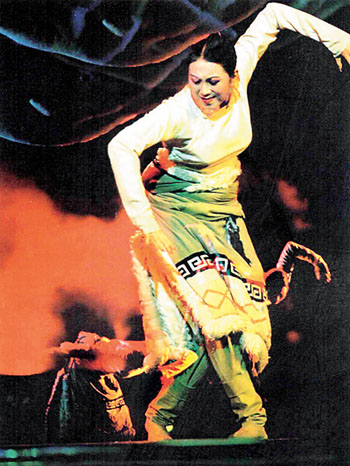 看過藏族獨舞《母親》的人,一定不會忘記那位年邁卻非常慈祥的母親,其重要的原因,是她彎曲前伏的身體帶給人們強烈的視覺感受。在創作藏族舞蹈《母親》時,我的基本做法就是讓演員把上身彎曲到90度,這是基于3個理由:第一,她是一位老人;第二,她是一位高原的老人;第三,她是一位具有宗教信仰的老人。