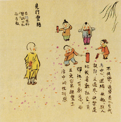 賢二出門被石頭硌了腳,賢二怕黑不敢去鎖院門,賢二想要超過賢一賢三賢四賢五,賢二做了好事不被認可很受傷很委屈……賢二是個可愛的小和尚,有著自己的小九九,他的煩惱,也正是我們日常生活中煩惱的縮影。而師父往往出場,指出煩惱之癥結所在,簡單幾句話掃清賢二的心頭陰霾,直指人心,比如“看不到別人的長處,恰恰證明自己功夫不夠”,比如“無我,無人,無眾生”,比如“放下”,等等。佛家講究當頭棒喝,大概就是這個了。星云大師也推薦認為:這些漫畫不刻板,不說教,文字淺白,“深者見深”。