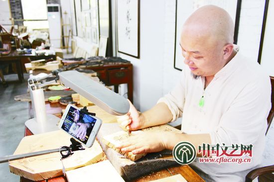 國家級非物質文化遺產(chǎn)項目十竹齋木版水印技藝代表性傳承人魏立中展示木版水印刻版環(huán)節(jié) 彭 揚 攝