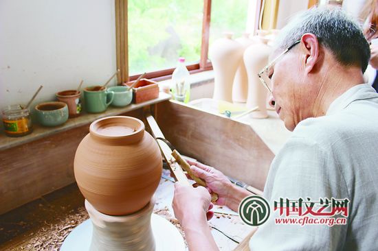 中國青瓷大師、“龍泉青瓷燒制技藝”傳承人陳壇根在直播現(xiàn)場展示龍泉青瓷跳刀工藝 彭 揚 攝
