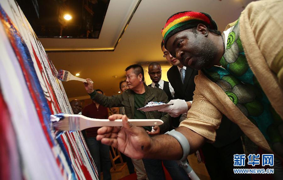 ??? 11月2日,兩國藝術(shù)家在展覽現(xiàn)場共同完成一幅具有莫桑比克風(fēng)情的畫作。當(dāng)日,中國—莫桑比克當(dāng)代藝術(shù)展“文化交響曲”在京開幕。本次藝術(shù)展是“2012非洲文化聚焦”活動的重要項(xiàng)目。此次藝術(shù)展共展出50余幅兩國藝術(shù)家的畫作。藝術(shù)展將于11月6日閉幕。(新華社記者 王申 攝)